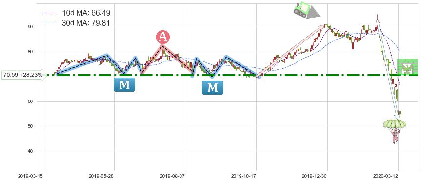 ♘ 阻力价格位70.59,可信任强度79.50%,距离最后交易2020-03-13形成的收盘价格55.05相差 +28.23%