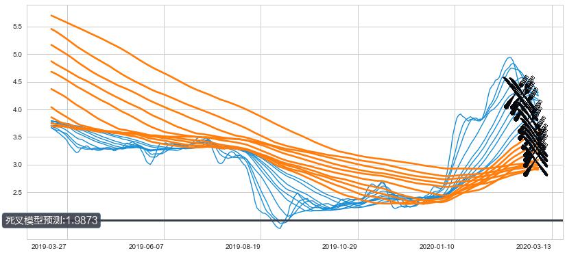 ➢ 90小时均线于(2020-03-11: 3.331)形成【死叉】基于【死叉历史模型】预测死叉后最低波谷价格: 1.7064, 死叉后最低价格2.990,尚未达到预测最低波谷价格, 预期继续下跌