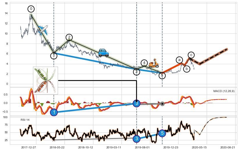 ➣ 波浪理论:猜想达到c点后小回调终止反转上涨 → 上涨 → 【拐点】临近 → 阶段均值回复结束后继续大周期趋势跟踪
