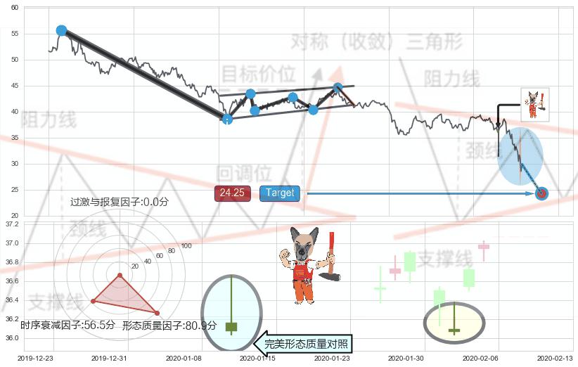 ➣ 【多空双方观望→争持→促使价格波动日益狭窄→空方打破攻守平衡点】对称三角形中继整理, 已在2020-02-18突破【支撑】颈线 36.11 →演变成下降通道