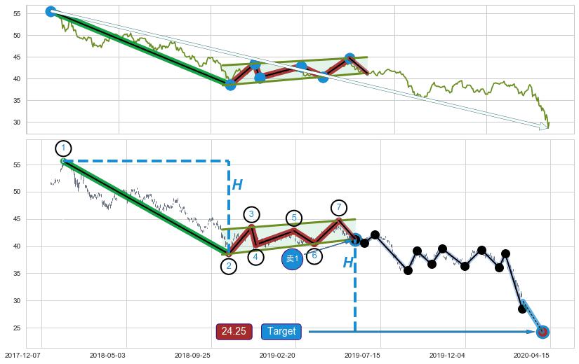 ➣ 升旗形:猜想下跌target达成后 → 上涨 → 机会信号 → 大趋势均值回复