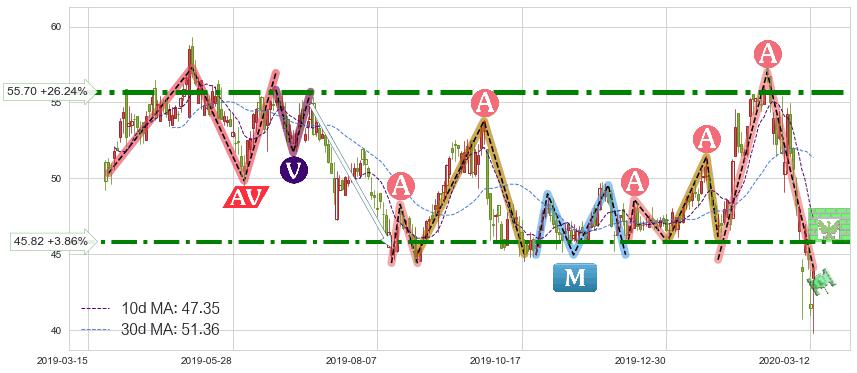 ♘ 阻力价格位55.70,可信任强度91.99%,距离最后交易2020-03-13形成的收盘价格44.12相差 +26.24%