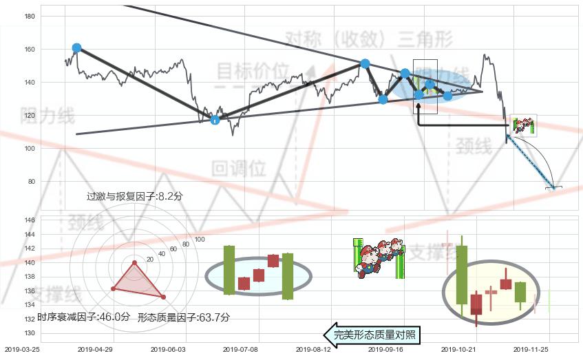 ➣ 【多空双方观望→争持→促使价格波动日益狭窄→空方打破攻守平衡点】对称三角形中继整理, 已在2019-12-05突破【支撑】颈线 131.91 →演变成下降通道