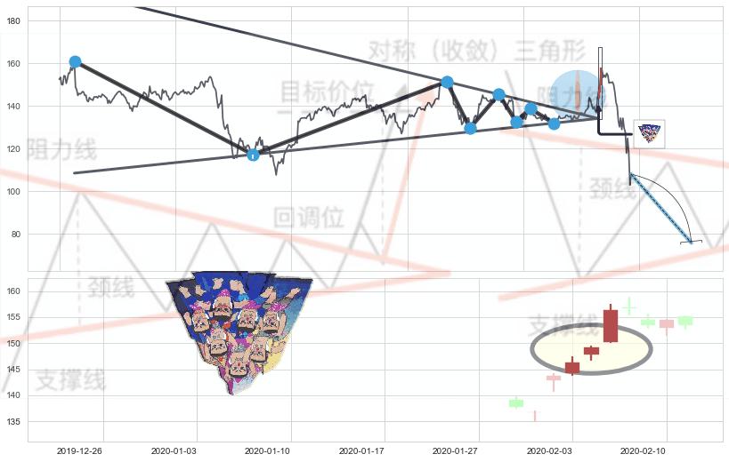 ➢ 吊颈线(上吊线) + 下降对称三角整理支撑破位转换阻力下跌信号叠加后【反向回撤率】极低,【看空】信号叠加【存续影响极大】