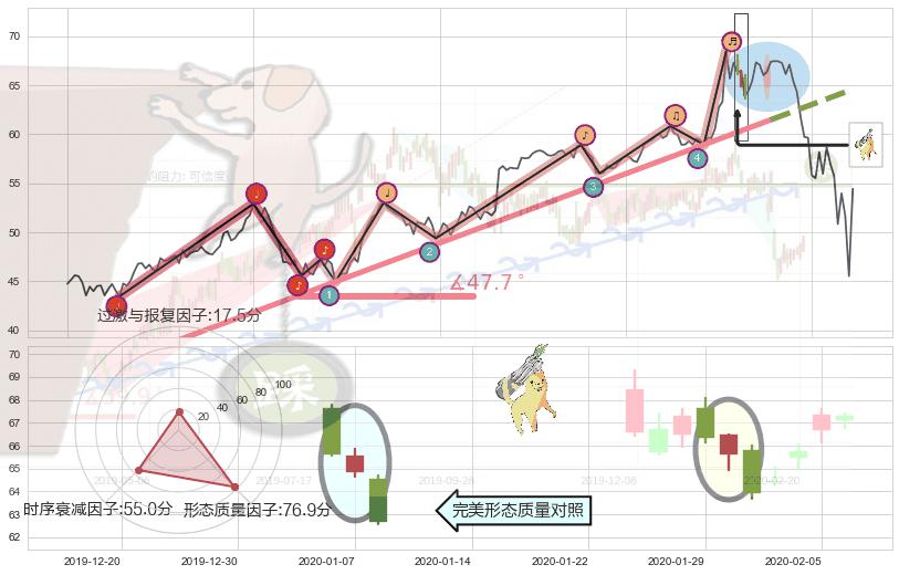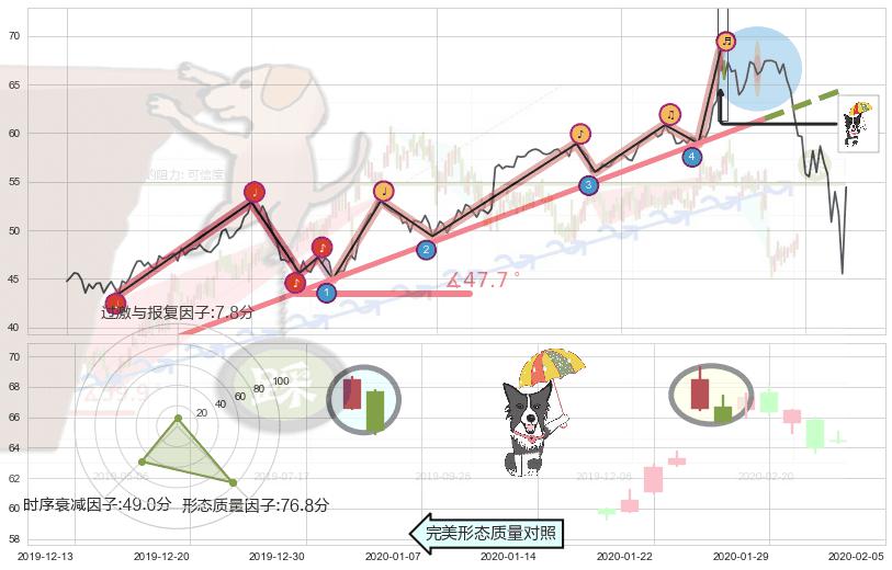 ➣ 2019-05-20-2020-02-11上升趋势存在反转[风险],其原上升趋势的支撑位(64.59)已破位[强阻力信号],原上升趋势角度: 47.7˚