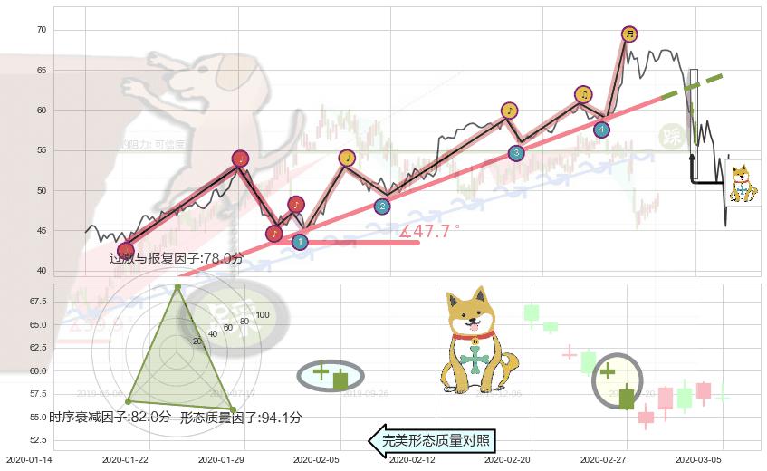 从2019-08-23至2020-02-11,共包含118个交易日,阶段股价上涨42.18%,阶段股价变动位移路程比: 1 : 3,上涨趋势角度: 39.4