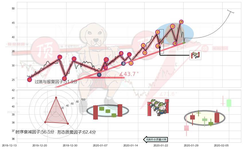 ➣ 【中枢B】:2020-01-22-2020-02-06,中枢由5笔构成,共12交易日, ZG=39.14, ZD=37.69