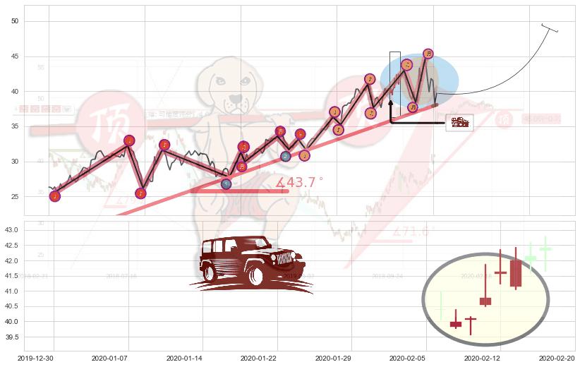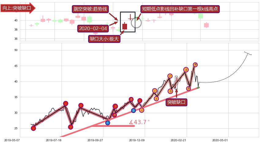 ➢ 低点影线(2020-02-05: 39.45 )→回踩→第一根k线高点(2020-02-03: 39.54 )