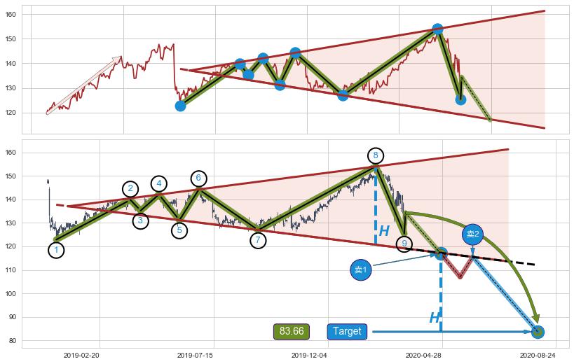 ➢ 最小反转跌幅→𝐇: 33.31 (逐步抬高阻力斜边最后的阻力点⑧与支撑边垂直距离)