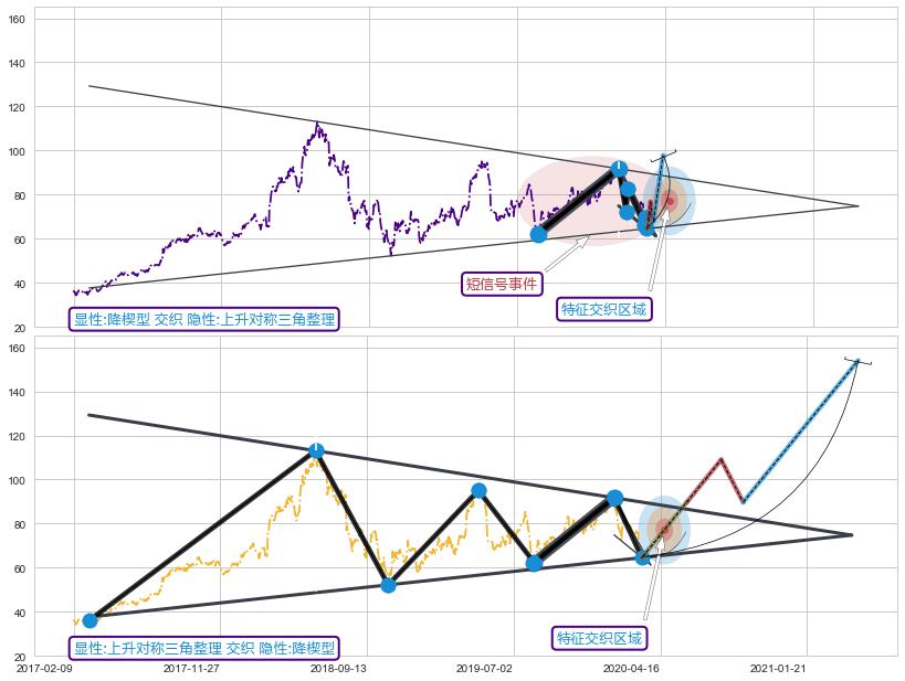 ➣ 上升对称三角整理:猜想临近关键阻力位突破点 → 临近拐点上涨 → 机会信号 → 大趋势均值回复