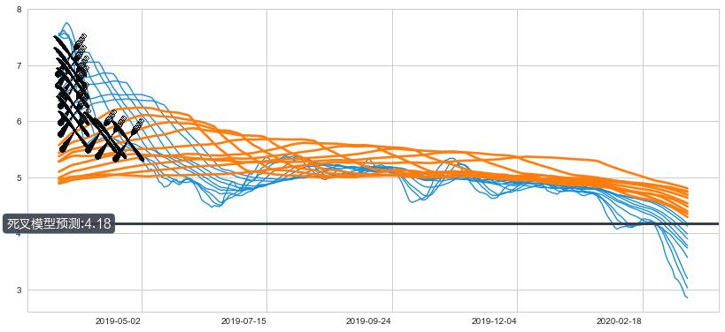 ➣ 80小时均线于(2019-04-08: 5.80)形成【死叉】基于【死叉历史模型】预测死叉后最低波谷价格: 3.813, 死叉后最低价格2.630,已经下跌超出预测最低波谷价格, 预期反弹