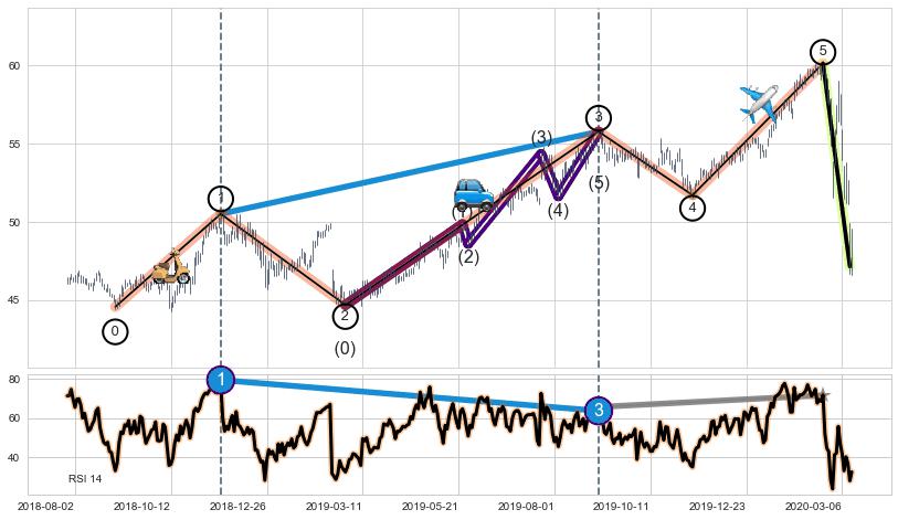 ➢ 上升趋势【顶点B】比【顶点A】高⤴️,【RSI】指标【顶点B】比【顶点A】低⤵️
