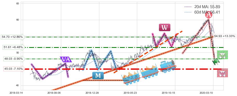 ♘ 阻力价格位54.70,可信任强度53.67%,距离最后交易2020-03-13形成的收盘价格48.47相差 +12.86%