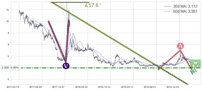 ♘ 阻力价格位2.000,可信任强度64.40%,距离最后交易2020-03-13形成的收盘价格2.010相差 -0.50%