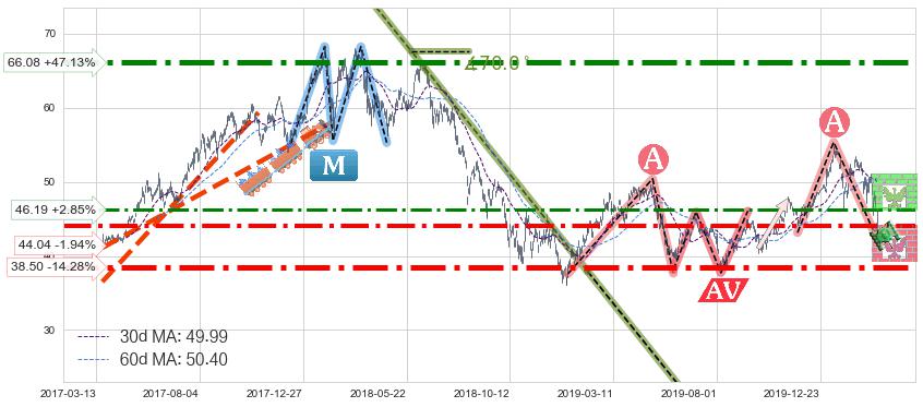 ♘ 支撑价格位44.04,可信任强度71.19%,距离最后交易2020-03-13形成的收盘价格44.91相差 -1.94%