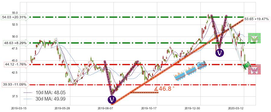 ♘ 支撑价格位44.12,可信任强度76.58%,距离最后交易2020-03-13形成的收盘价格44.91相差 -1.76%