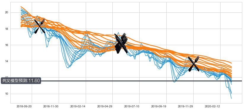 ➣ 21小时均线于(2019-11-29: 13.68)形成【死叉】基于【死叉历史模型】预测死叉后最低波谷价格: 10.09, 死叉后最低价格8.56,已经下跌超出预测最低波谷价格, 预期反弹