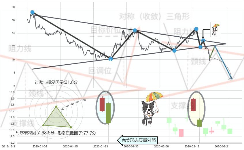 ➣ 【多空双方观望→争持→促使价格波动日益狭窄→空方打破攻守平衡点】对称三角形中继整理, 已在2020-02-24突破【支撑】颈线 11.97 →演变成下降通道