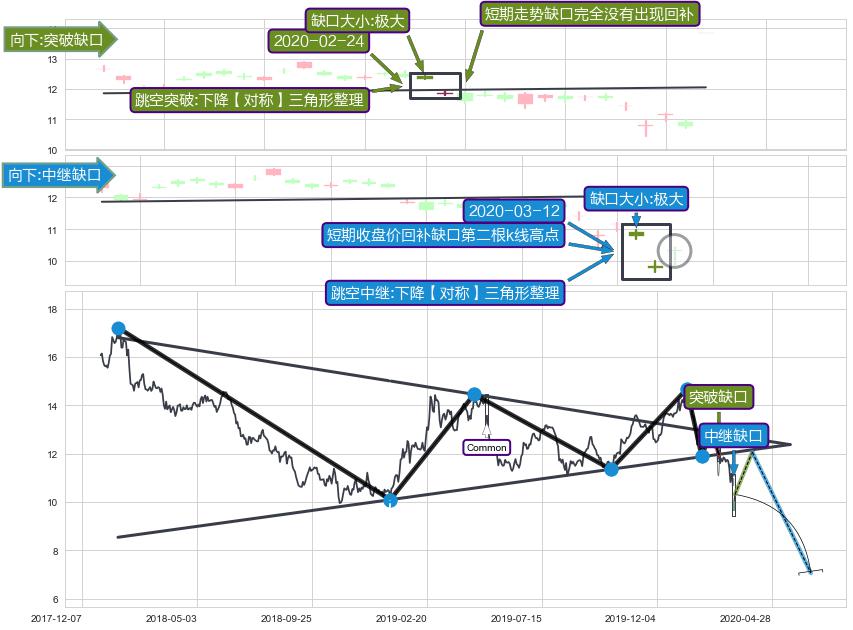 ➣ 普通缺口在【下降【对称】三角形整理】震荡整理形态中出现