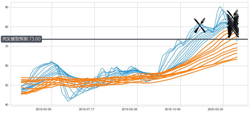 ➣ 60小时均线于(2020-03-06: 80.55)形成【死叉】基于【死叉历史模型】预测死叉后最低波谷价格: 72.12, 死叉后最低价格66.82,已经下跌超出预测最低波谷价格, 预期反弹