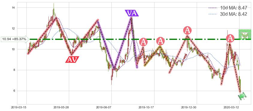 ♘ 阻力价格位10.94,可信任强度79.50%,距离最后交易2020-03-13形成的收盘价格5.90相差 +85.37%