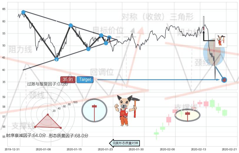 ➢ 锤头线(锤子线) 🔜 下降对称三角整理临近target支撑拐点上涨 综合量化分数:50.36 【中性】
