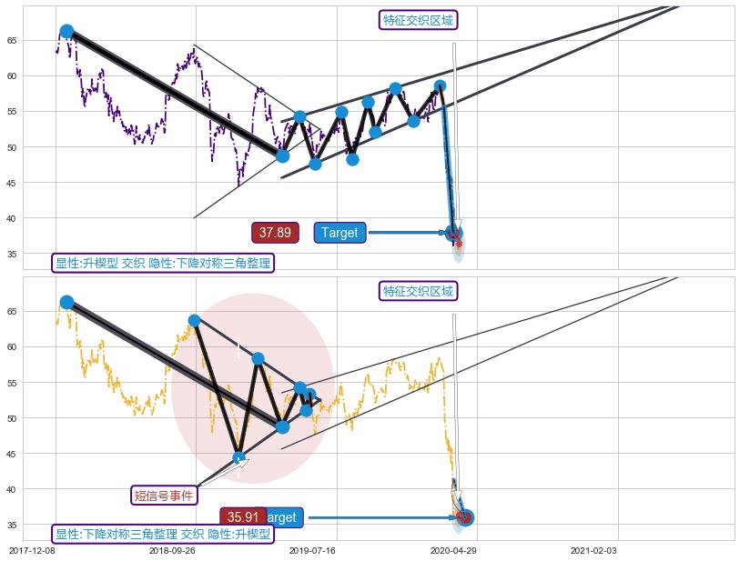 ➢ 下降对称三角整理:猜想预期下跌目标target即将达成,随后猜想强支撑来临,预期反弹上涨(均值回复)