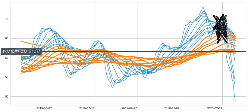 ➣ 70小时均线于(2020-02-20: 67.01)形成【死叉】基于【死叉历史模型】预测死叉后最低波谷价格: 60.87, 死叉后最低价格44.15,已经下跌超出预测最低波谷价格, 预期反弹