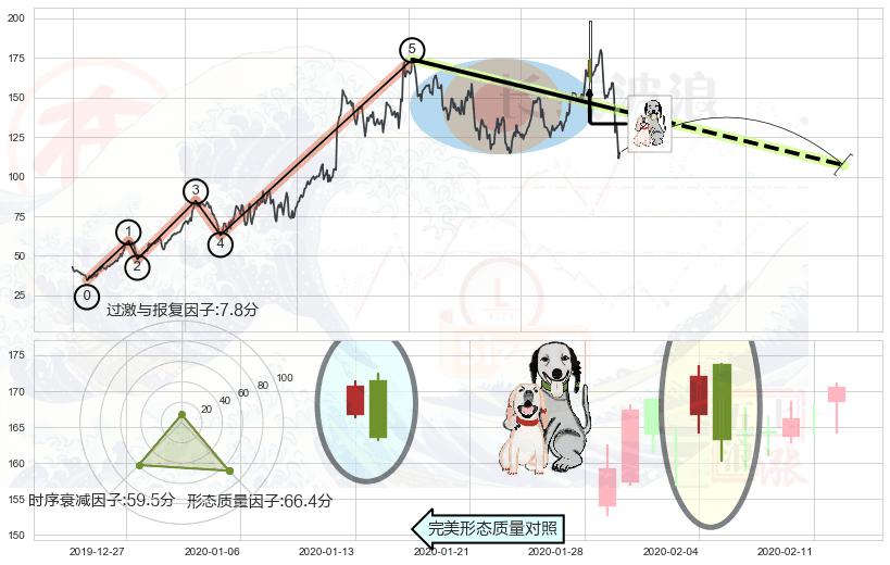 ➢ 顶部尽头线(下山虎) + 波浪理论上涨浪:浪5回调拐点信号叠加后【反向回撤率】低,【看空】信号叠加【存续影响大】