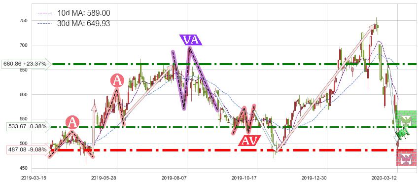 ♘ 支撑价格位487.08,可信任强度93.77%,距离最后交易2020-03-13形成的收盘价格535.69相差 -9.08%
