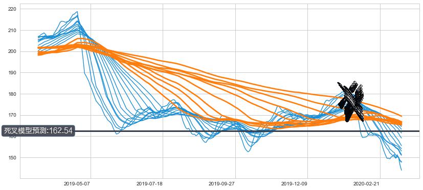 ➣ 70小时均线于(2020-01-27: 172.25)形成【死叉】基于【死叉历史模型】预测死叉后最低波谷价格: 158.14, 死叉后最低价格133.58,已经下跌超出预测最低波谷价格, 预期反弹