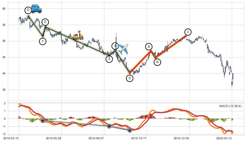 ➢ 锯齿型:子浪535结构 ⓑ点振幅较小,ⓒ点继续发力远超ⓐ点结束位置