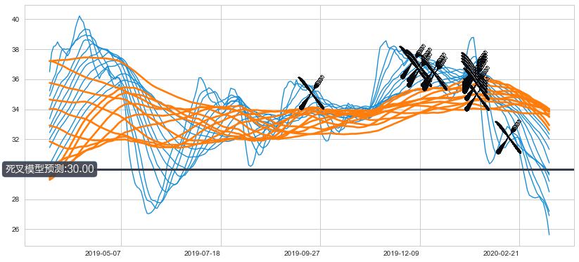➣ 70小时均线于(2020-01-17: 36.12)形成【死叉】基于【死叉历史模型】预测死叉后最低波谷价格: 30.42, 死叉后最低价格23.57,已经下跌超出预测最低波谷价格, 预期反弹