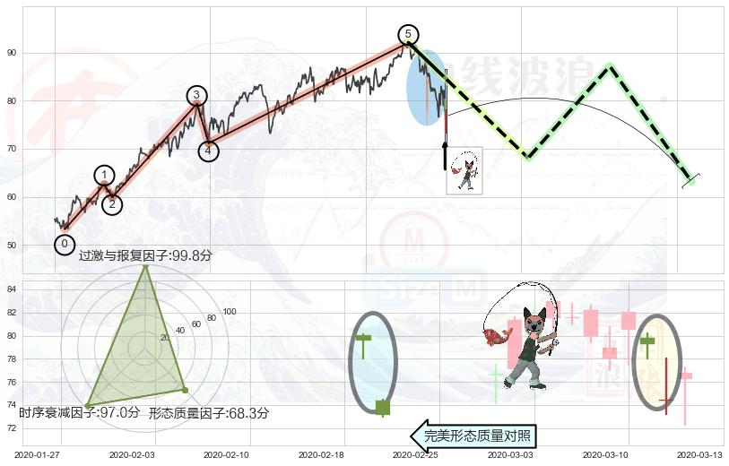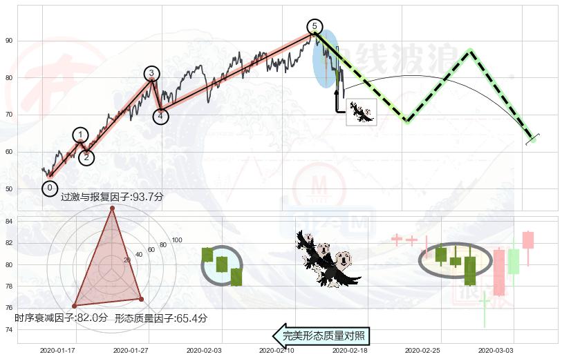 ➢ 顶部尽头线(下山虎) + 波浪理论上涨浪:浪5回调拐点信号叠加后【反向回撤率】低,【看空】信号叠加【存续影响大】