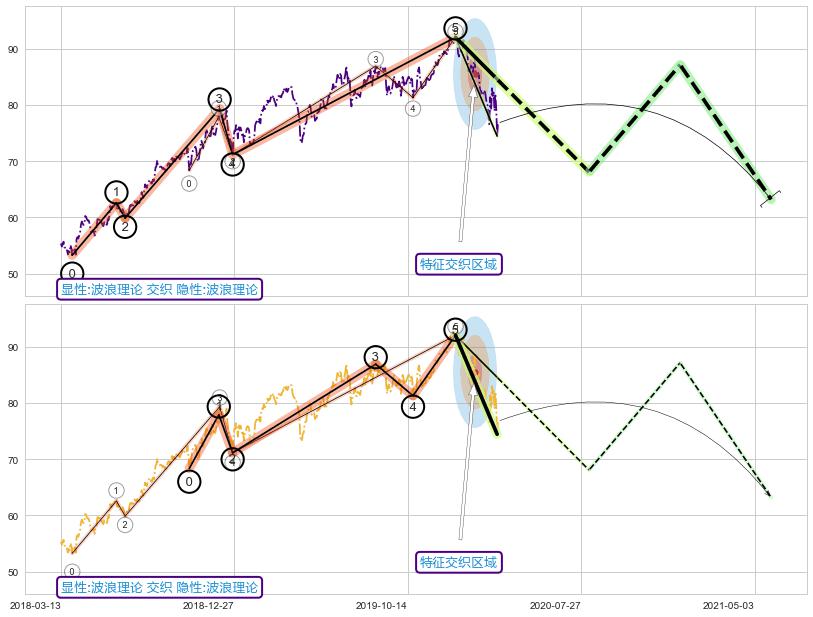 ➣ 顶部尽头线(下山虎) + 波浪理论上涨浪:浪5回调拐点信号叠加后【目标达成率】偏高,【看空】信号叠加【存续影响降权】