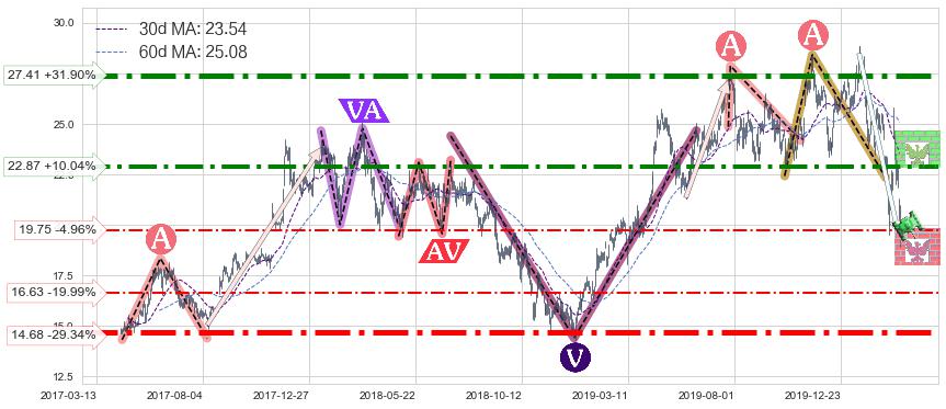 ♘ 阻力价格位22.87,可信任强度82.00%,距离最后交易2020-03-13形成的收盘价格20.78相差 +10.04%