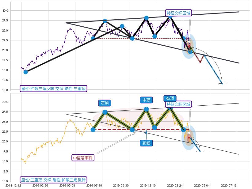 ➣ 扩散三角反转:猜想临近关键支撑位突破点 → 临近拐点下跌 → 风险信号 → 大趋势均值回复