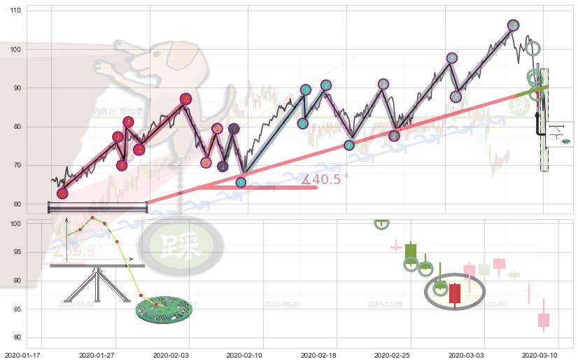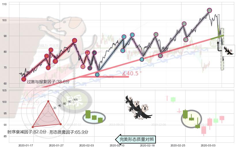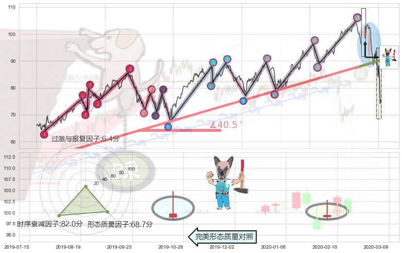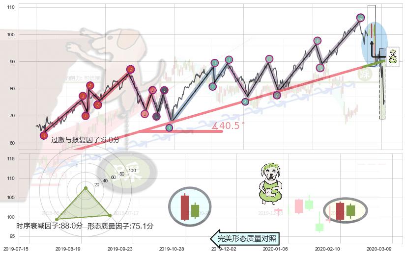 ➢ 2017-10-12-2020-03-11上升趋势存在反转[风险],其原上升趋势的支撑位(85.66)已破位[强阻力信号],原上升趋势角度: 32.2˚