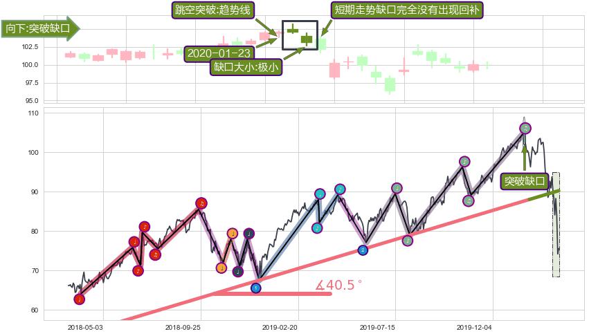➢ 2018-04-02-2020-01-30上升趋势存在反转[风险],其原上升趋势的支撑位(90.26)已破位[强阻力信号],原上升趋势角度: 40.5˚