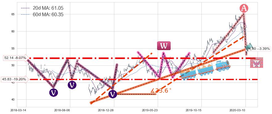 ♘ 支撑价格位52.14,可信任强度94.71%,距离最后交易2020-03-13形成的收盘价格56.72相差 -8.07%