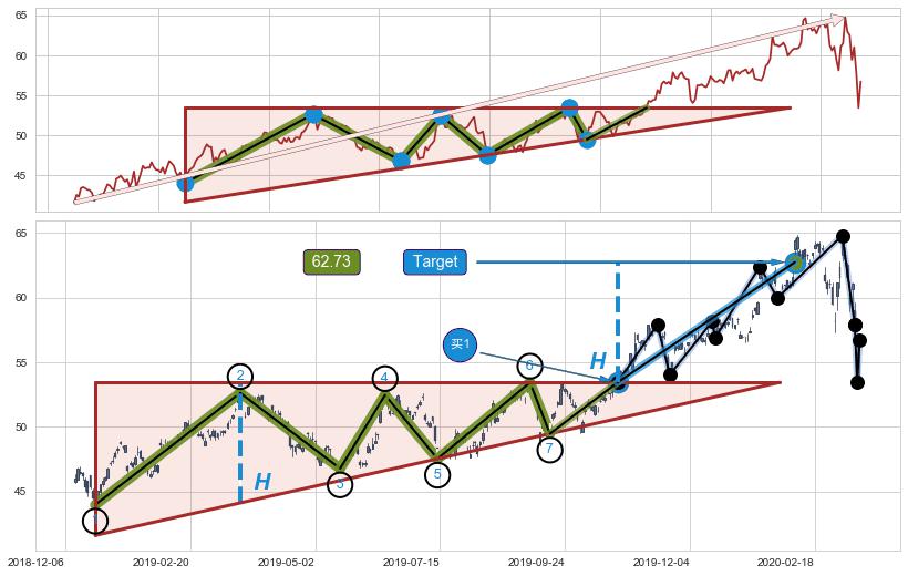 ➢ 【空方力量耗尽,多方打破攻守平衡点】上升三角形中继整理, 已在2019-10-23突破【阻力】颈线 53.43 →演变成上升通道