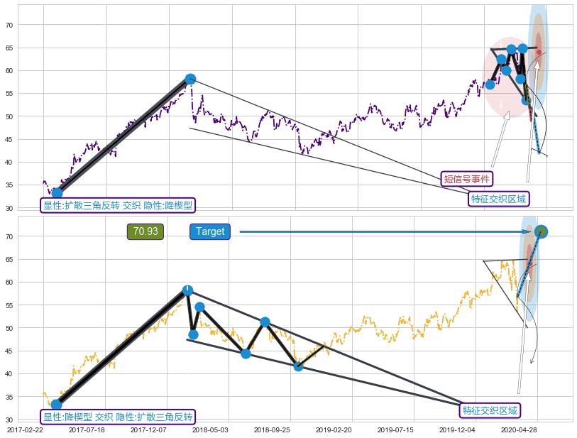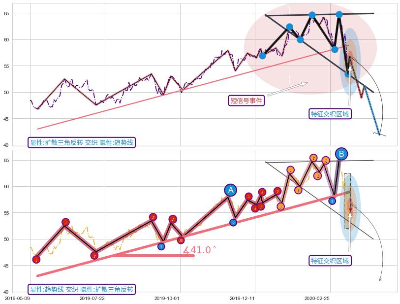 ➢ 扩散三角反转:猜想临近关键支撑位突破点 → 临近拐点下跌 → 风险信号 → 大趋势均值回复