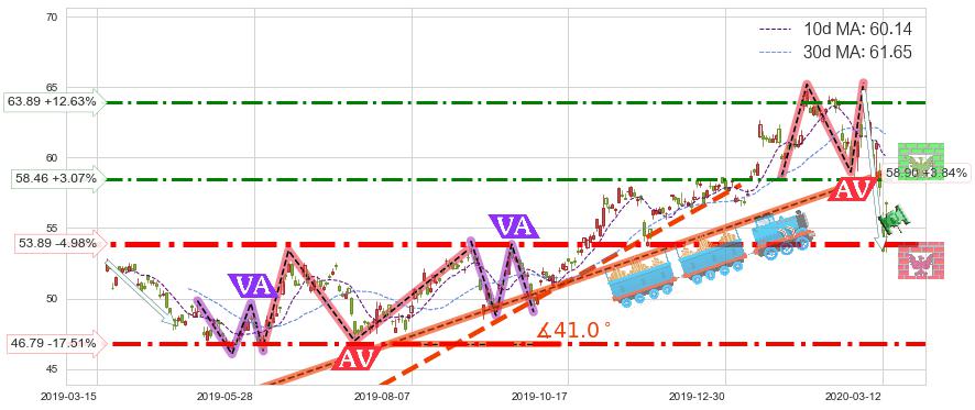 ✂️ 2019-05-16-2020-03-11上升趋势存在反转[风险],其原上升趋势的支撑位(58.90)已破位[强阻力信号],原上升趋势角度: 41.0˚