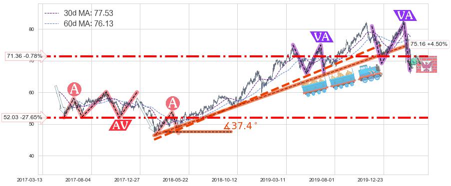 ➢ 【卖0】上涨趋势线在→(2020-03-11: 75.05 )被突破,反转趋势形成