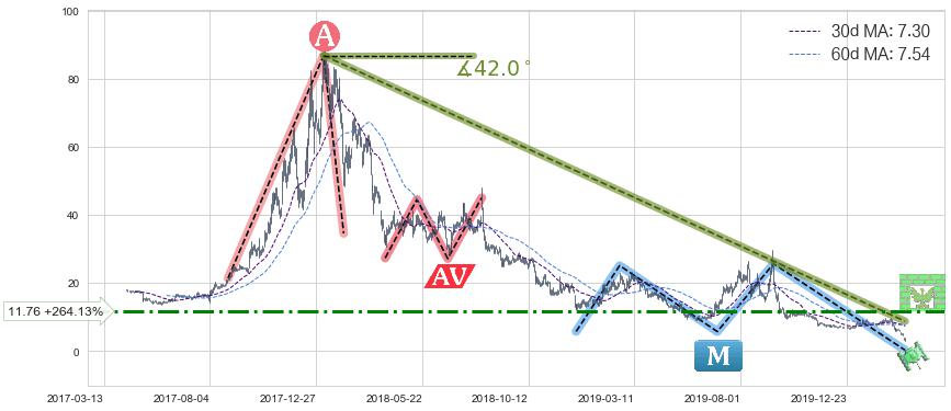 从2018-01-08至2020-03-13,共包含549个交易日,阶段股价下跌-229.89%,阶段股价变动位移路程比: 1 : 9,下跌趋势角度: 42.0