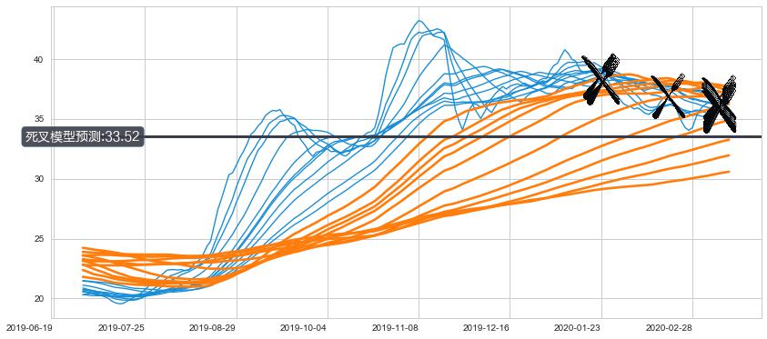 ➣ 35小时均线于(2020-01-22: 38.42)形成【死叉】基于【死叉历史模型】预测死叉后最低波谷价格: 34.04, 死叉后最低价格32.80,已经下跌超出预测最低波谷价格, 预期反弹