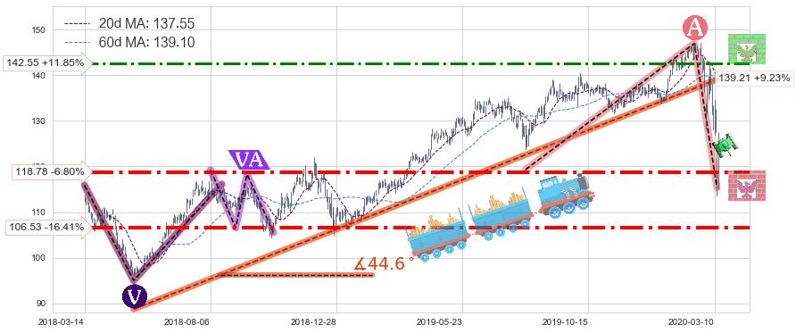 ✂️ 2018-05-09-2020-03-11上升趋势存在反转[风险],其原上升趋势的支撑位(139.21)已破位[强阻力信号],原上升趋势角度: 44.6˚