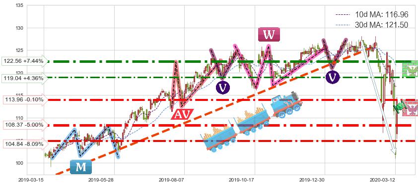 ♘ 阻力价格位119.04,可信任强度69.10%,距离最后交易2020-03-13形成的收盘价格114.07相差 +4.36%