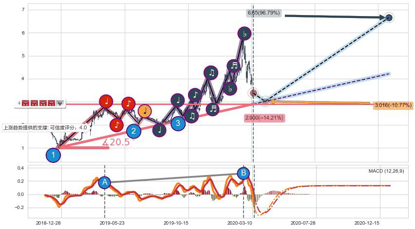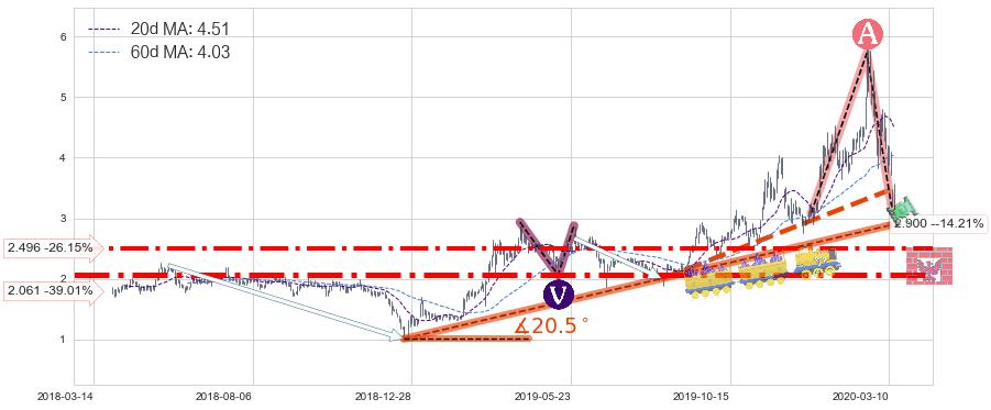 ♘ 支撑价格位2.061,可信任强度90.95%,距离最后交易2020-03-13形成的收盘价格3.380相差 -39.01%