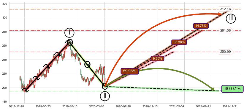 ➣ AI预测: 假定反转启动后, 第❸目标位置(2022-02-01, 264.74)
